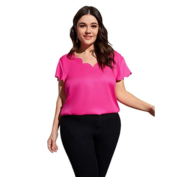Romwe Women S Plus Size Scallop Trim Short Sleeve V Neck Work Office Blouse Top Shirt Hot Pink 2xl Walmart Com
